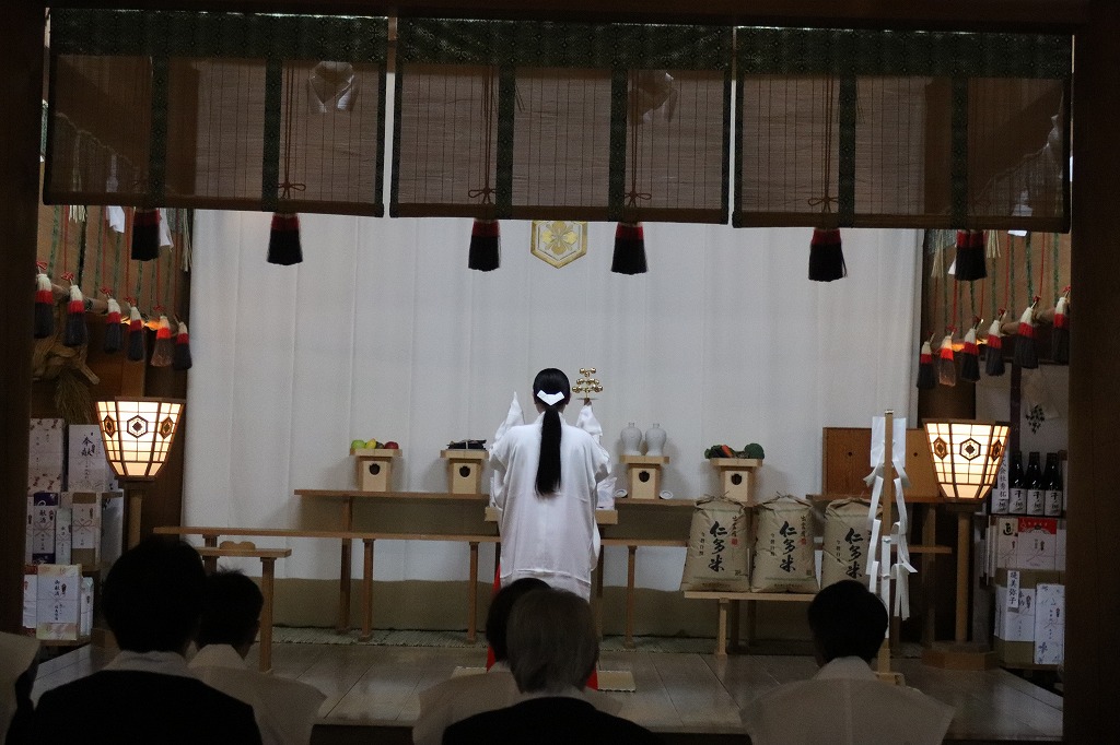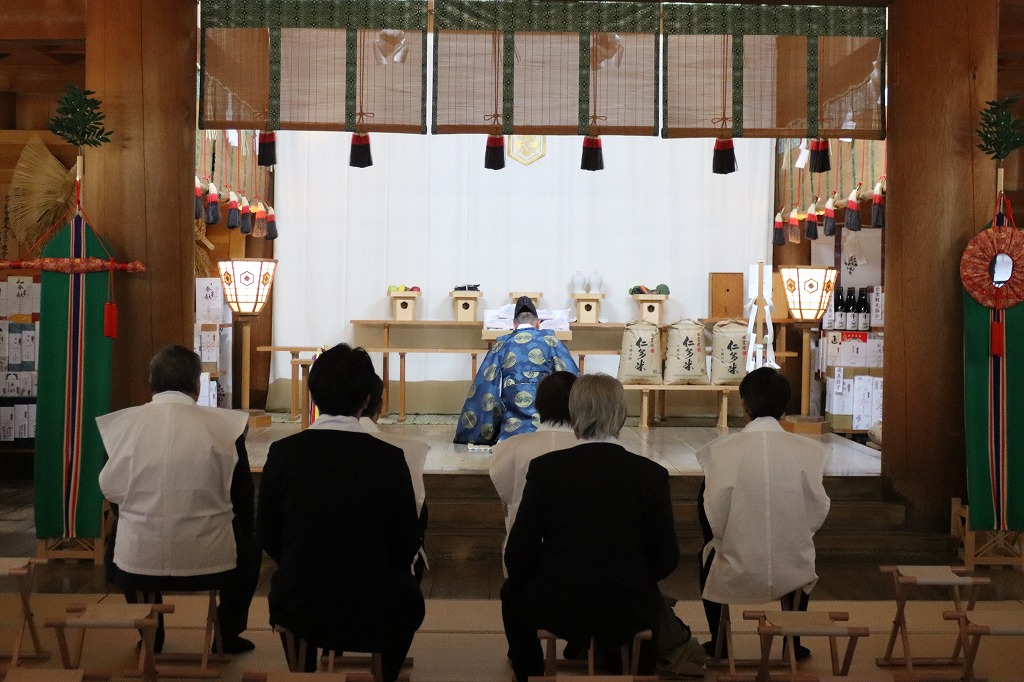 12月16日、奥出雲町長 糸原 保氏、献穀者 野原幸雄ご夫妻他9名より宮中行事である新嘗祭に本年献穀されましたお米と同じ献穀田で収穫のお米「仁多米コシヒカリ」の奉納があり、拝殿に於いて奉納奉告祭が斎行されました。