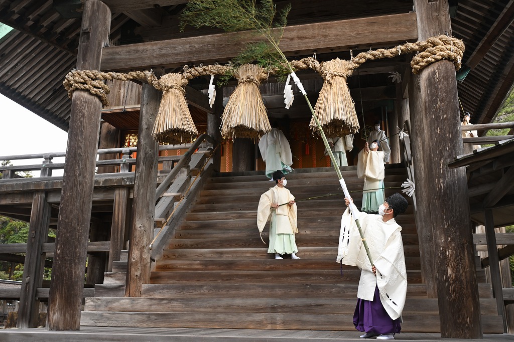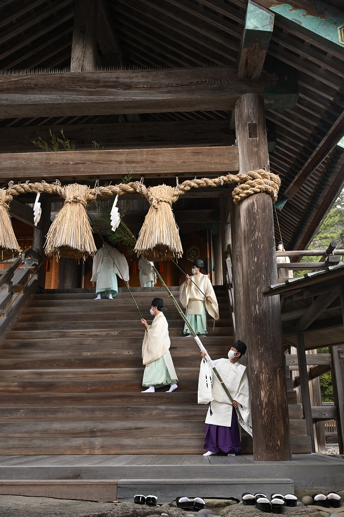 祭典・神事 御煤払 12月20日、御煤払(おすすはらい)が厳かに奉仕されました。 御煤払奉仕のため神職が御本殿に参進。御日供祭祝詞奏上の後、笹や和紙を先につけた特製の長い竹はたきを手に隈無くチリを払い落とし、拭き清めました。 出雲大社ではこの御煤払を皮切りに摂社・末社など全ての建物の大掃除が行なわれます。 基本情報 日 程 令和7年12月20日 祭典・神事一覧に戻る